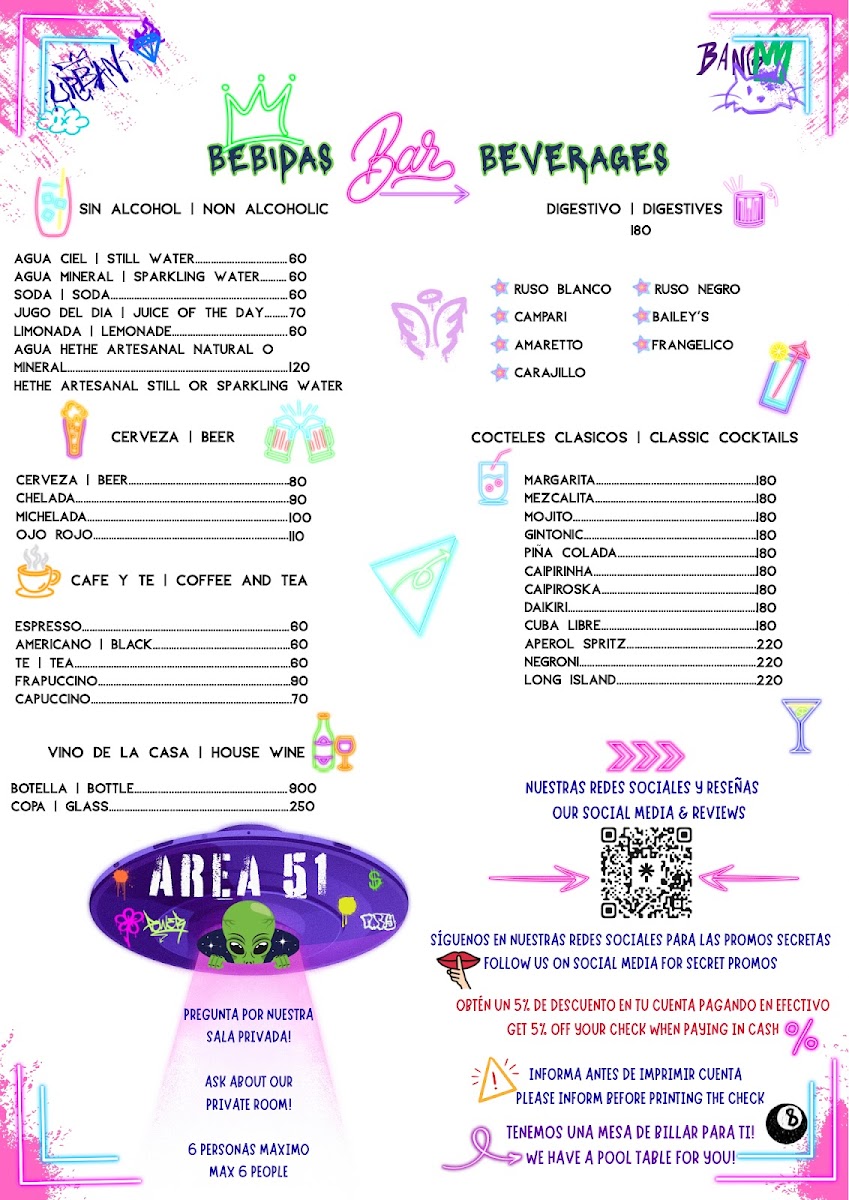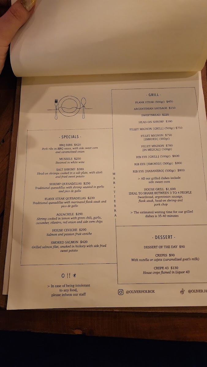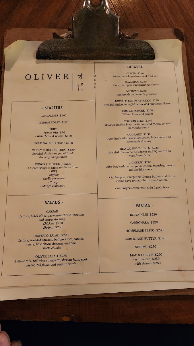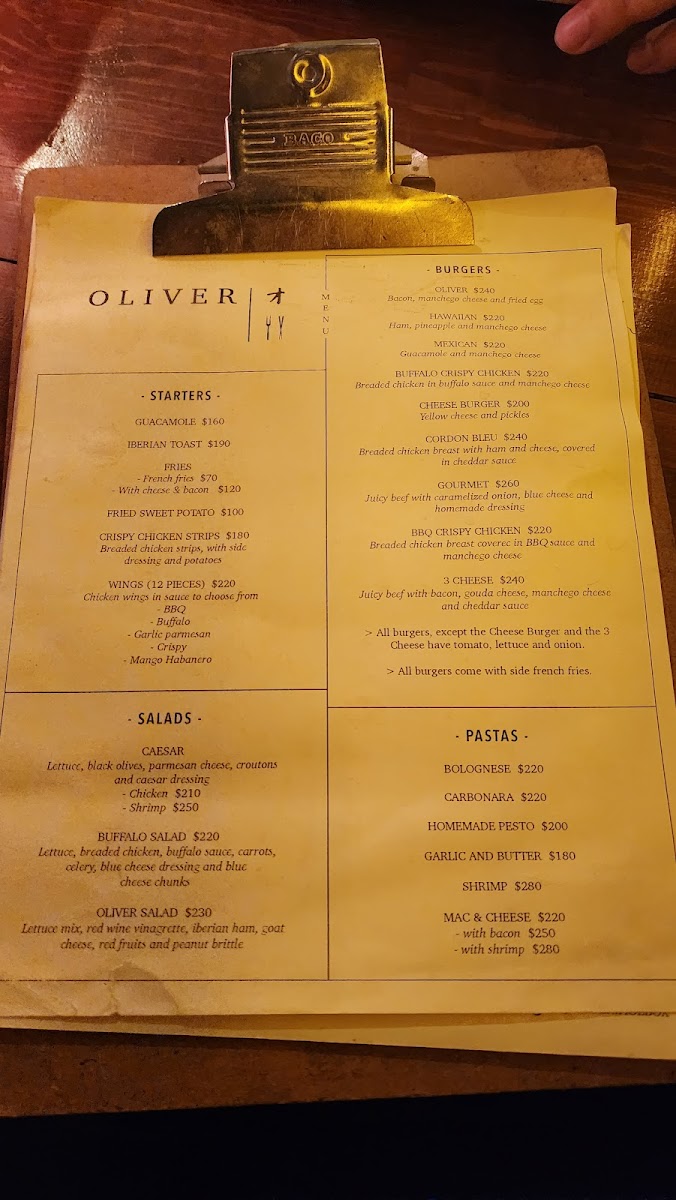 Oliver's Steakhouse offers a diverse and flavorful menu that caters to a variety of tastes. For starters, you can enjoy dishes like Guacamole, Cheese Sticks, and Crispy Chicken Strips, all perfect for sharing. The wings selection is particularly noteworthy, with options like Wings 12 pcs and Ruleta Mix 20 pcs. If you're in the mood for something heartier, the hot dogs stand out with unique creations such as The Quesudo, The Yucateco, and The Choriloco. The burger section boasts bold flavors with options like the signature Oliver Burger, Xolo Burger, and the delicious Buffalo Chicken Sandwich. For pasta lovers, there’s a choice between classic dishes like Bolognese, Carbonara, and more adventurous options such as Garlic & Shrimp and Garlic & Flank Steak. The specials include mouthwatering items like BBQ Ribs, Shrimp Quesadillas, and Campechano Nachos. Complementing the meal, the restaurant offers a selection of beverages, from refreshing Soda and Lemonade to classic cocktails such as the Margarita, Mojito, and Piña Colada. If you’re in the mood for a digestif, options like Bailey's and Amaretto are available. Finally, don’t forget to finish off with the Dessert of the Day, rounding out a well-rounded, satisfying dining experience at Oliver’s Steakhouse.